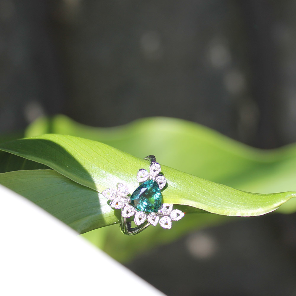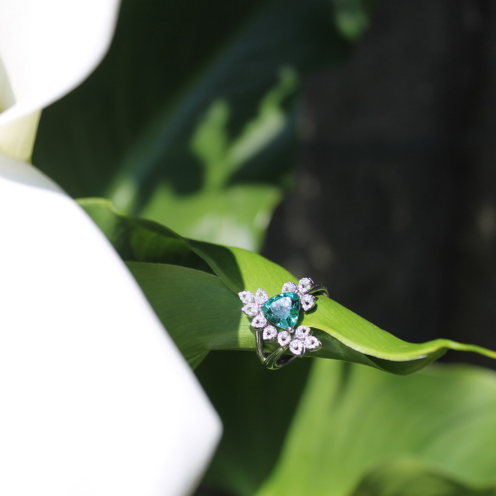 Al centro, una splendida tormalina indicolite a forma trillion è incorniciata da un raffinato design di foglie tempestato di diamanti bianchi, che ne esaltano la bellezza.