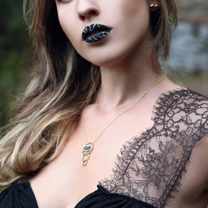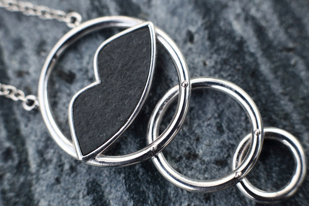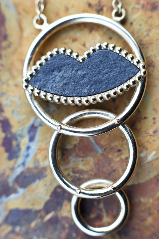 I tre cerchi intrecciati rappresentano il viaggio della vita: esperienze, crescita personale e connessione interiore. Al centro le labbra in ardesia sono incorniciate da un delicato contorno di micro borchiette, aggiungendo audacia e luminosità.