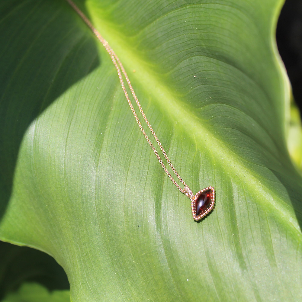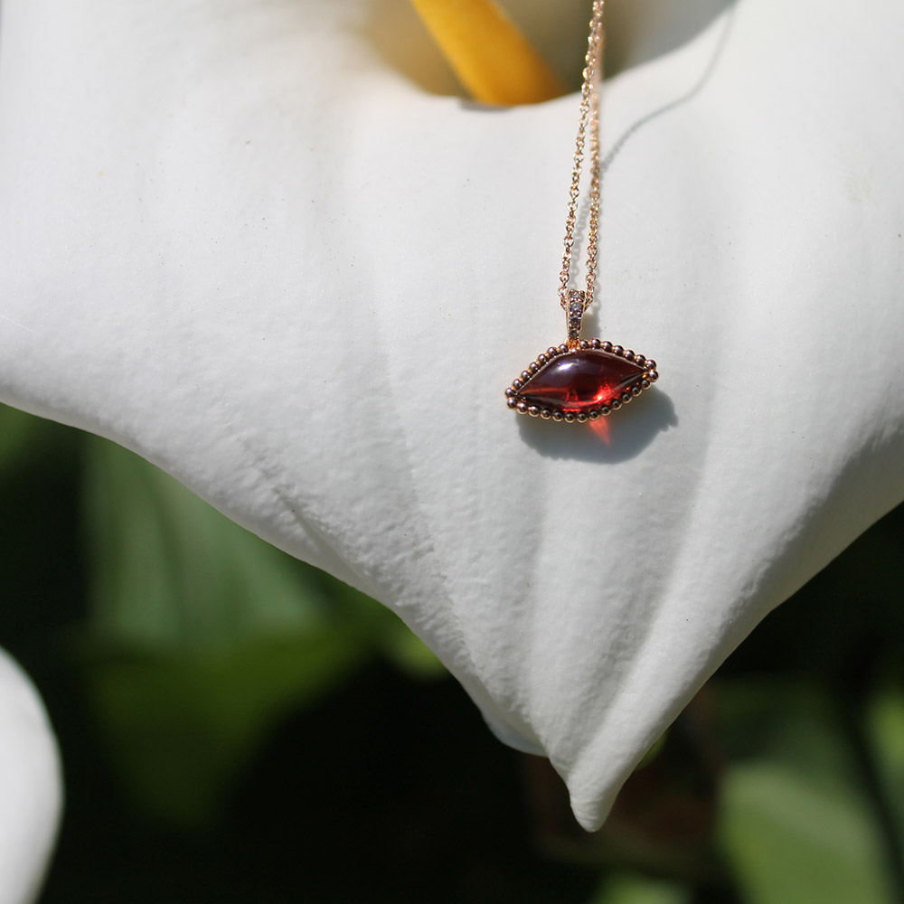 Il ciondolo labbra ti lascerà senza parole. Le labbra CARNOSE in granato cobochon sbocciano come un fiore, contornate da microsfere in oro rosa.